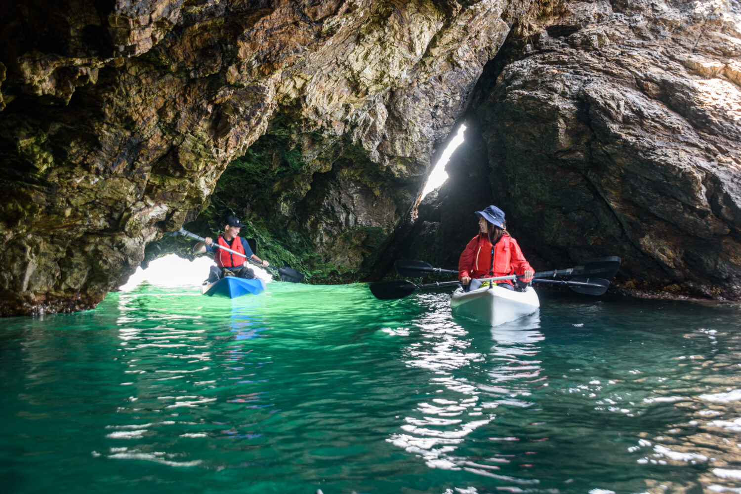 福井県若狭常神エリアにある「青の洞窟」へのカヤックツアー!若狭湾の美しい自然を体感することのできるアクティビティーです。透明度の高い海と壮大な岩壁に囲まれた青の洞窟へ探検に出かけよう!透き通るような海水に光が差し込むと、洞窟内は鮮やかなエメラルドグリーの輝きに包まれ幻想的な雰囲気に!この夏の忘れられない思い出となることでしょう。